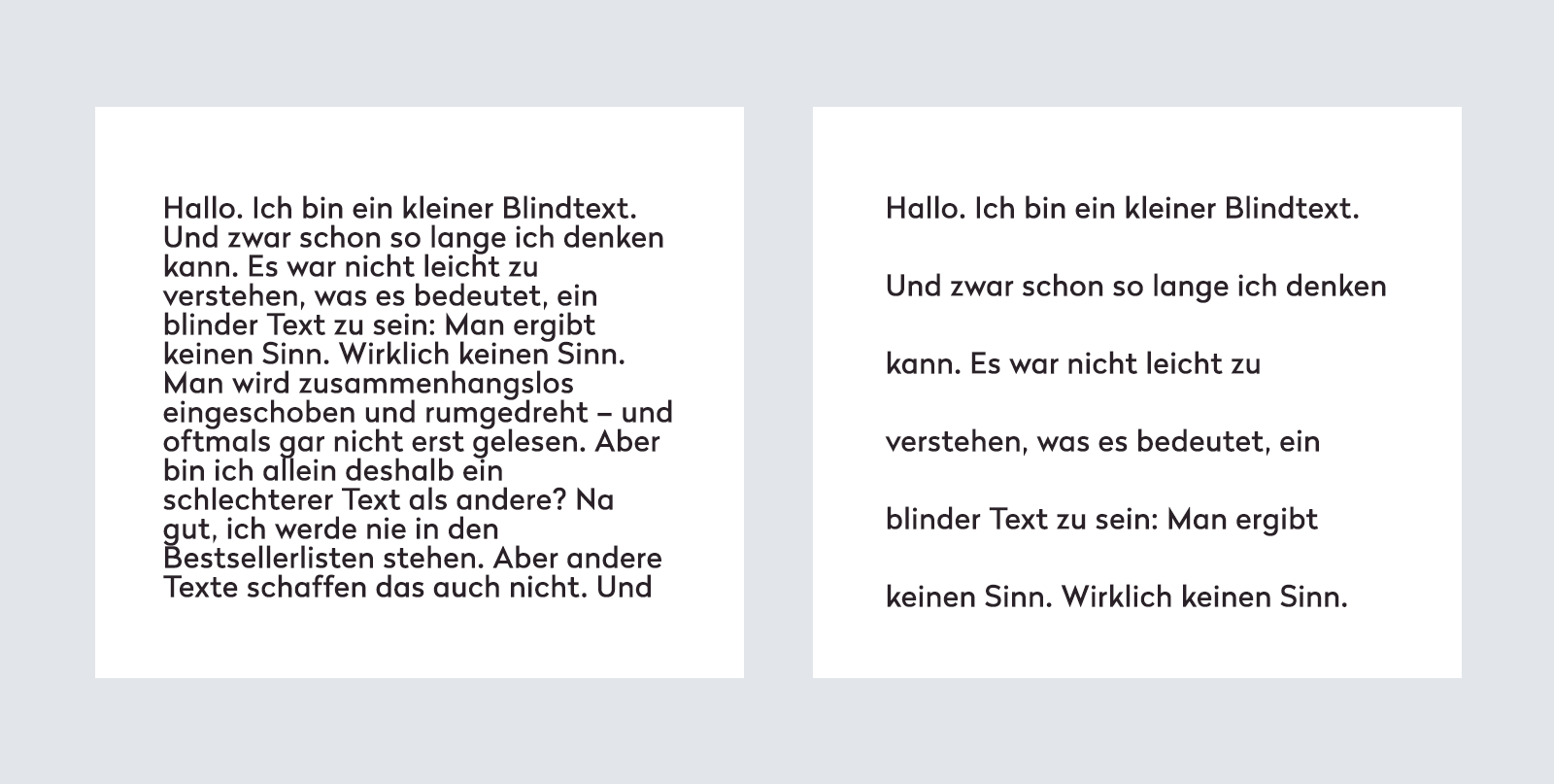 La longueur des lignes exerce également une influence sur la rapidité de la lecture et son confort. Les lignes trop courtes ont un impact sur la fluidité de la lecture, l’œil devant constamment faire des va-et-vient. Les lignes trop longues peuvent également perturber la lecture, car il est plus difficile pour l’œil de sauter de la fin d’une ligne au début de la suivante. L’espace entre les lignes ne doit être ni trop étroit (il est alors difficile de séparer les lignes les unes des autres), ni trop important (les lignes n’étant plus perçues comme appartenant à un ensemble).