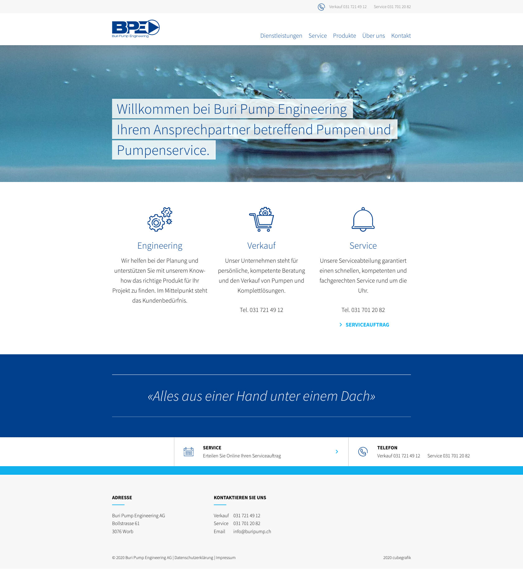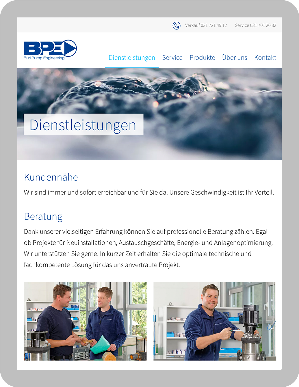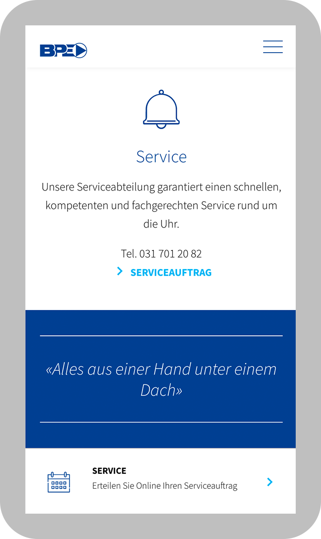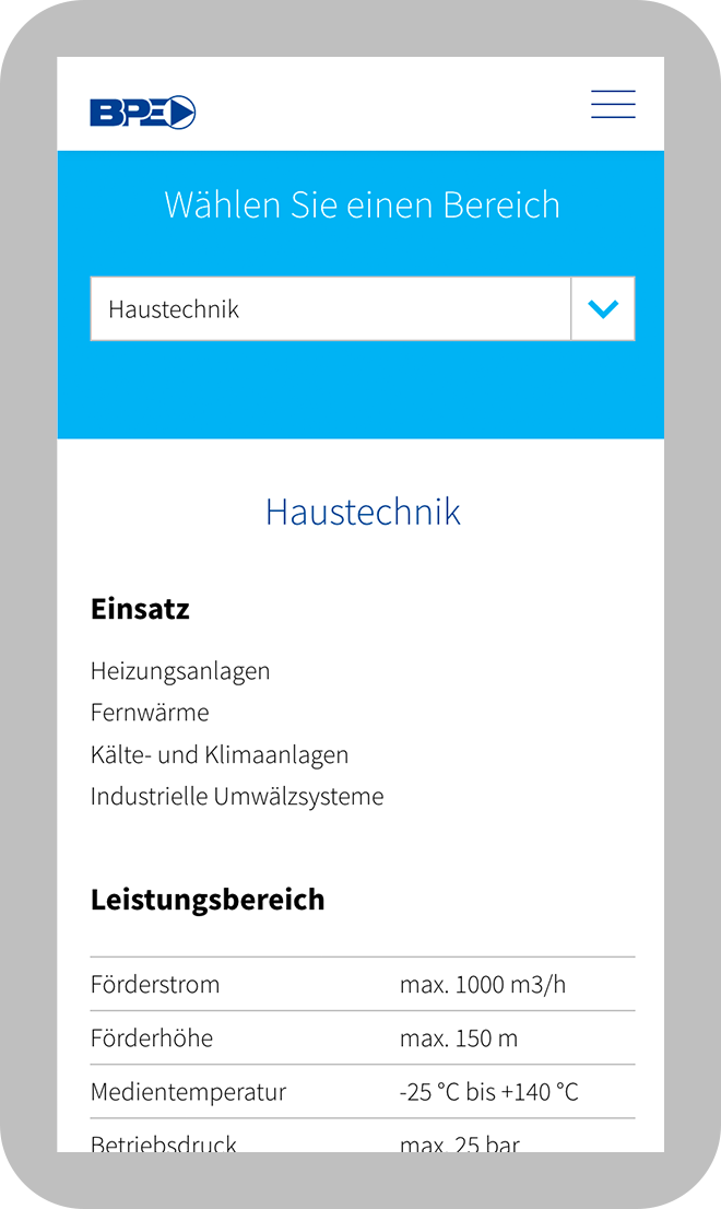 Da die Kunden von Buri Pump Engineering viel unterwegs sind, wurde die Website nach dem Mobile First Prinzip (die Gestaltung geht vom kleinsten Screen aus) konzipiert.