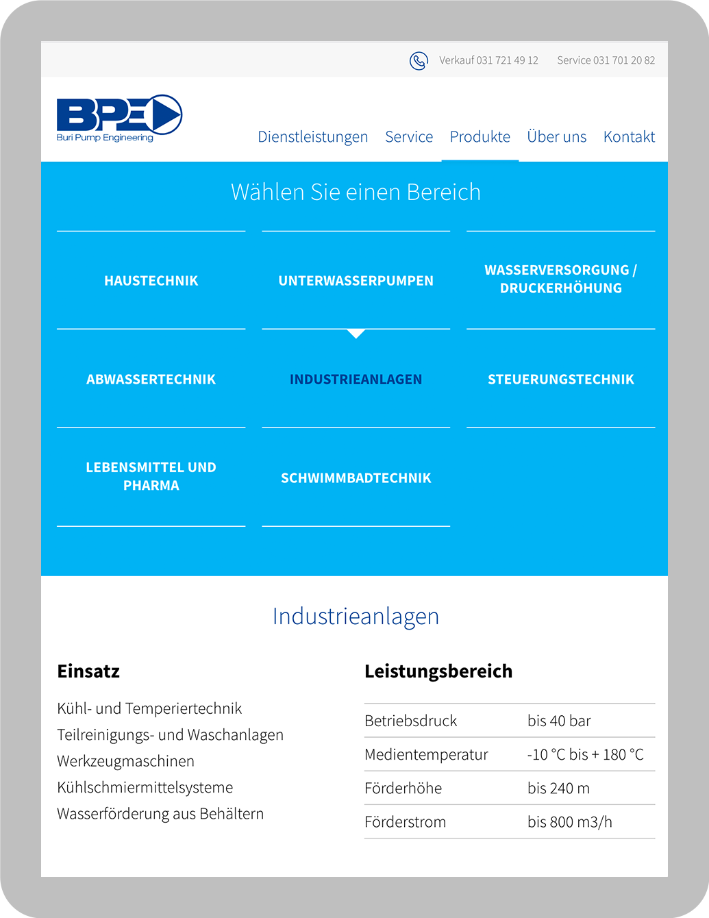 Buri Pump Engineering garantiert einen effizienten Service für alle ihre Produkte rund um die Uhr. Wichtig für das Design war daher, dass Service und Verkaufstelefonnummern ohne viel Aufwand sofort auffindbar sind.